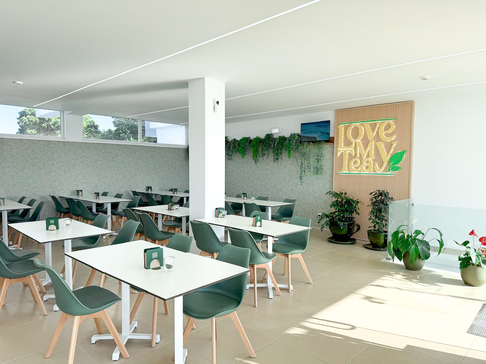 As divisórias e revestimentos naturais, como os painéis em madeira ripada, alinham-se à comunicação visual da marca, evidenciada pelo destaque da sinalização “Love My Tea”. O espaço multifuncional permite refeições rápidas, momentos de convívio e espera, integrando diferentes tipos de utilização num ambiente harmonioso, funcional e convidativo.